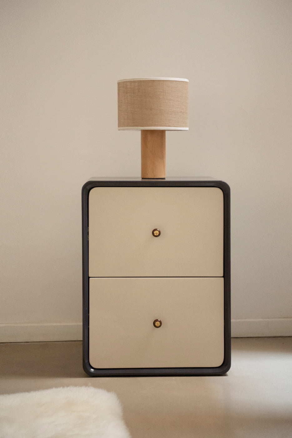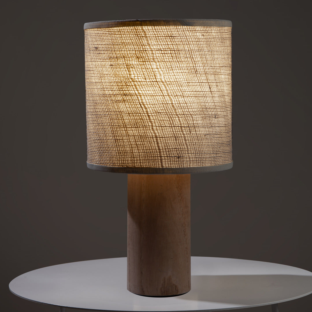 La base, torneada en madera maciza de Guatambú, aporta calidez y solidez, mientras que la pantalla de arpillera tamiza la luz suavemente, generando una atmósfera cálida y natural.