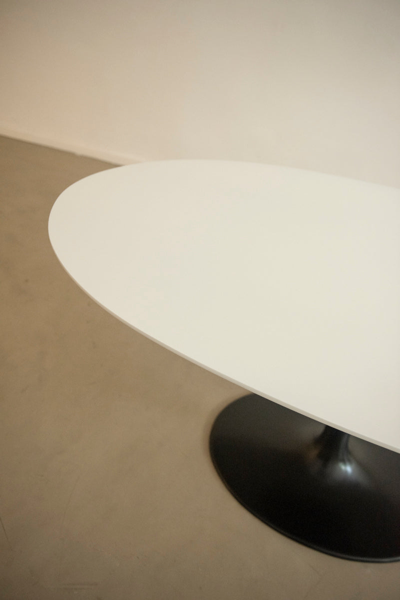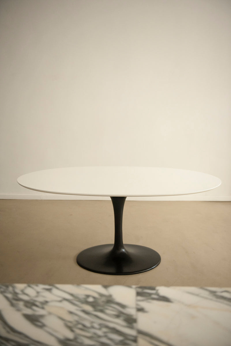 La mesa Tulip es un diseño icónico de Eero Saarinen, creado en 1956. Se caracteriza por su base única en forma de pedestal que reemplaza las tradicionales cuatro patas y una tapa redonda u ovalada de líneas suaves y minimalistas. Su silueta elegante y escultural la convierte en un clásico del diseño moderno.